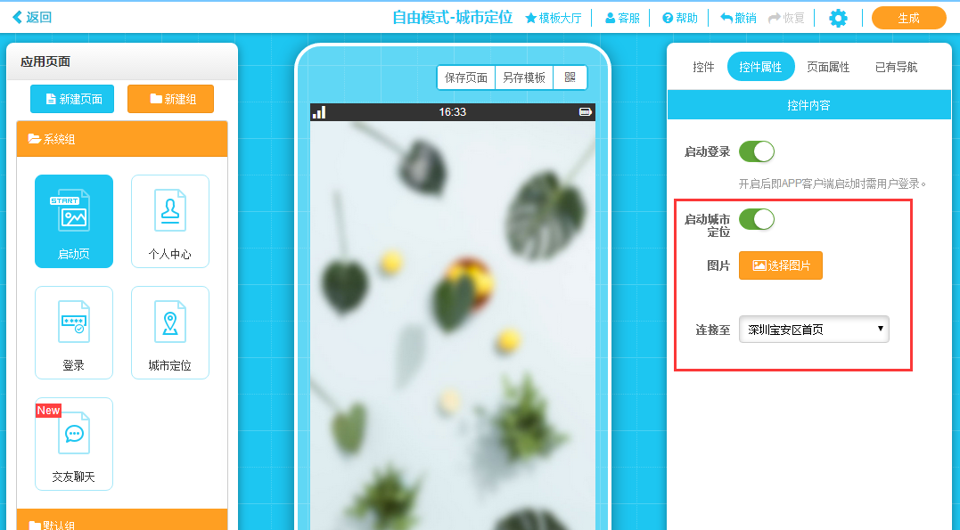 1.城市定位設置頁面在制作頁面的系統組中,如果不使用城市定位功能,可以不用管它。使用時,先在城市定位頁面右側的控件屬性——控件內容中新增城市,然后將新增城市鏈接到該城市指定的頁面即可。設置好每個城市的指定頁面后,用戶只需在城市定位頁面點擊某個城市,就可以跳轉到指定的頁面。(城市定位最多可以精確到區/縣。)開啟“設為熱門”,該城市就會顯示在熱門城市中。