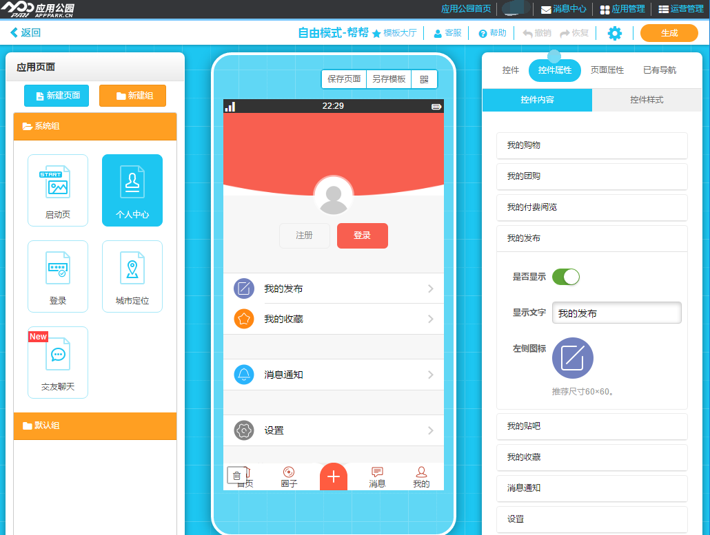 6.設(shè)置好分類后,打開制作頁(yè)面,先在“系統(tǒng)組”的“個(gè)人中心”頁(yè)面,將“我的發(fā)布”打開。