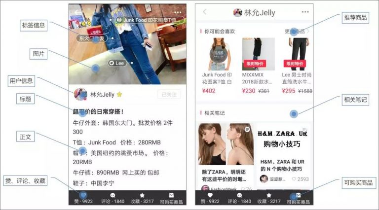 小紅書所有的內容結構都非常清晰,包括用戶信息、圖文、標簽、標題、**、評論、收藏等等,還推薦相關的商品。