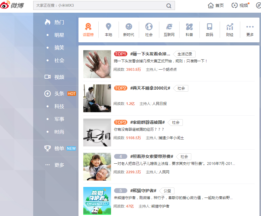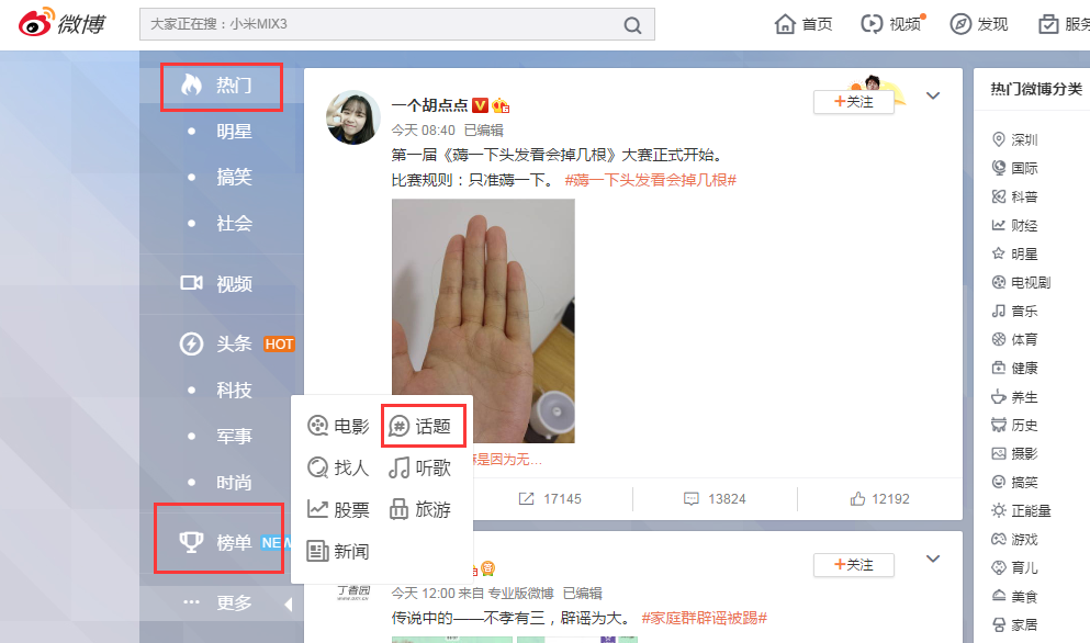 微博熱點可以通過熱門標簽、榜單、話題查看。這些排名靠前的微博,除去明星類的,其他都具有代表性。