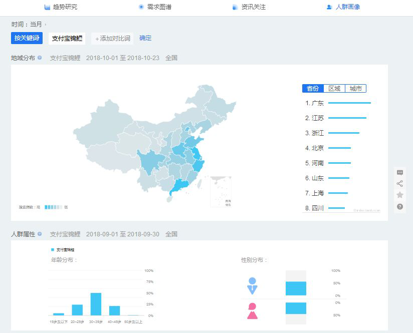 通過關鍵詞查看熱點的搜索量、人群畫像等。